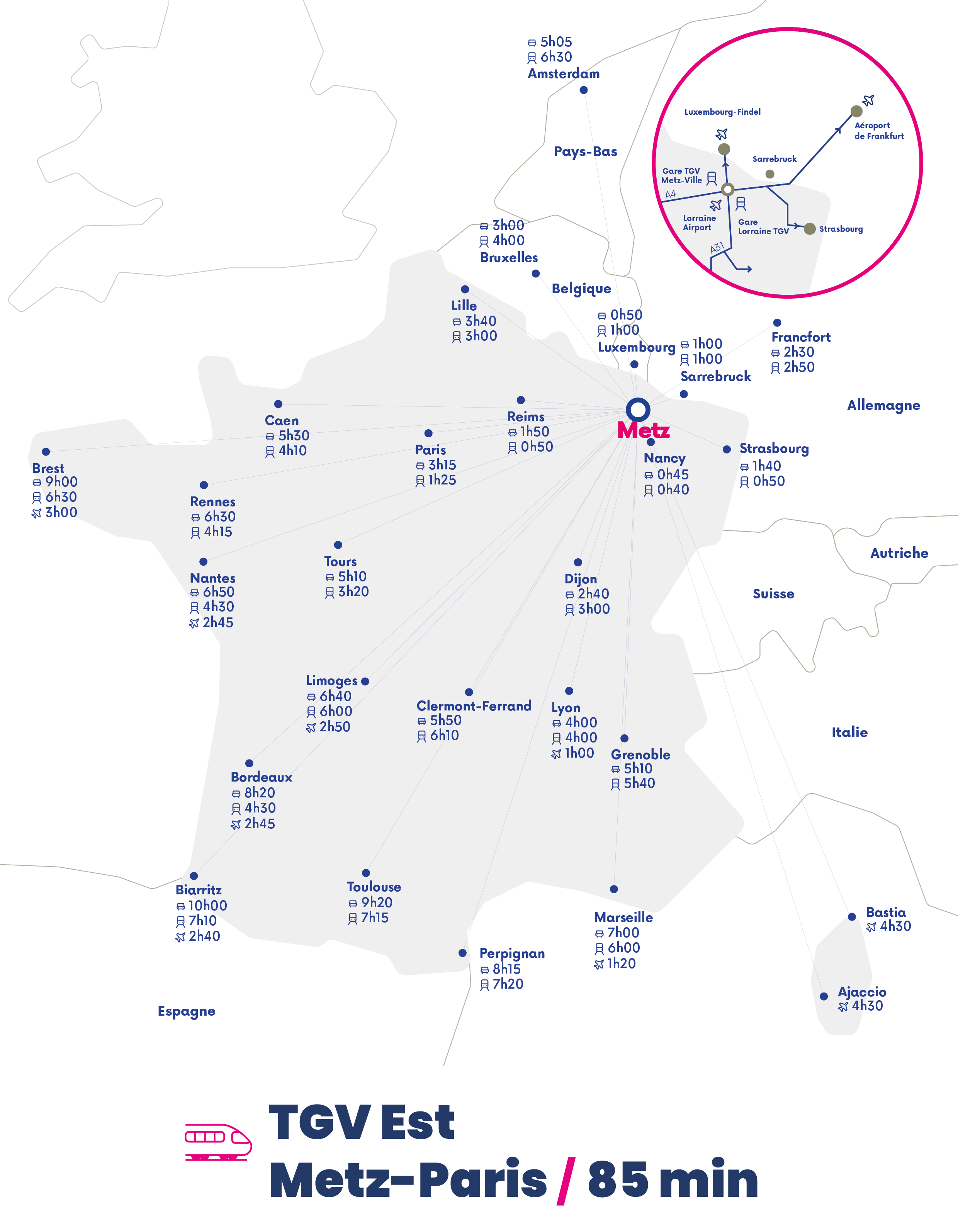 Facile d’accès, en avion, en TGV ou en voiture, l’Eurométropole de Metz est reliée au monde : 2 autoroutes (A31 et A4), 4 aéroports (Lorraine Airport, Luxembourg Findel, Sarrebruck et Roissy Charles de Gaulle), et 2 gares (Metz-ville et Lorraine TGV), et relie Paris en 85 minutes.
